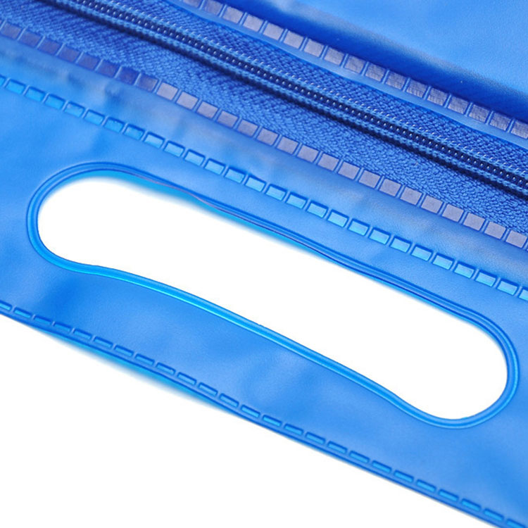 நிற்கும் PVC Zipper நீர்ப்புகா பையின் PVC பொருள் தடிமனாக உள்ளது. கைப்பிடி வலுவானது மற்றும் நீடித்தது மற்றும் பல முறை பயன்பாட்டிற்குப் பிறகு சிதைக்காது. இது பல்வேறு வண்ணங்களைக் கொண்டுள்ளது மற்றும் பணக்கார வண்ணங்களுடன் தனிப்பயனாக்கலாம்.